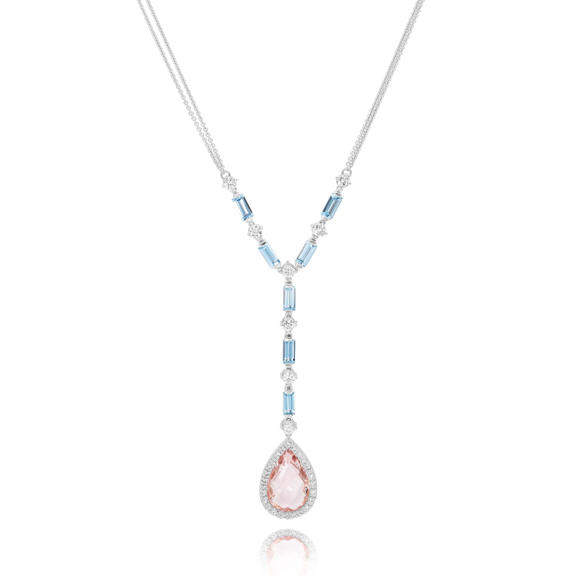 Fabulous statement necklet with a stunning 17mm x11mm. facted pear shaped morganite, rubover set and surrounded by claw set brilliant cut diamonds, drop feature comprising baguette cut aquamarines and brilliant cut diamonds, alternately claw set, all intergrated on a double trace link chain!