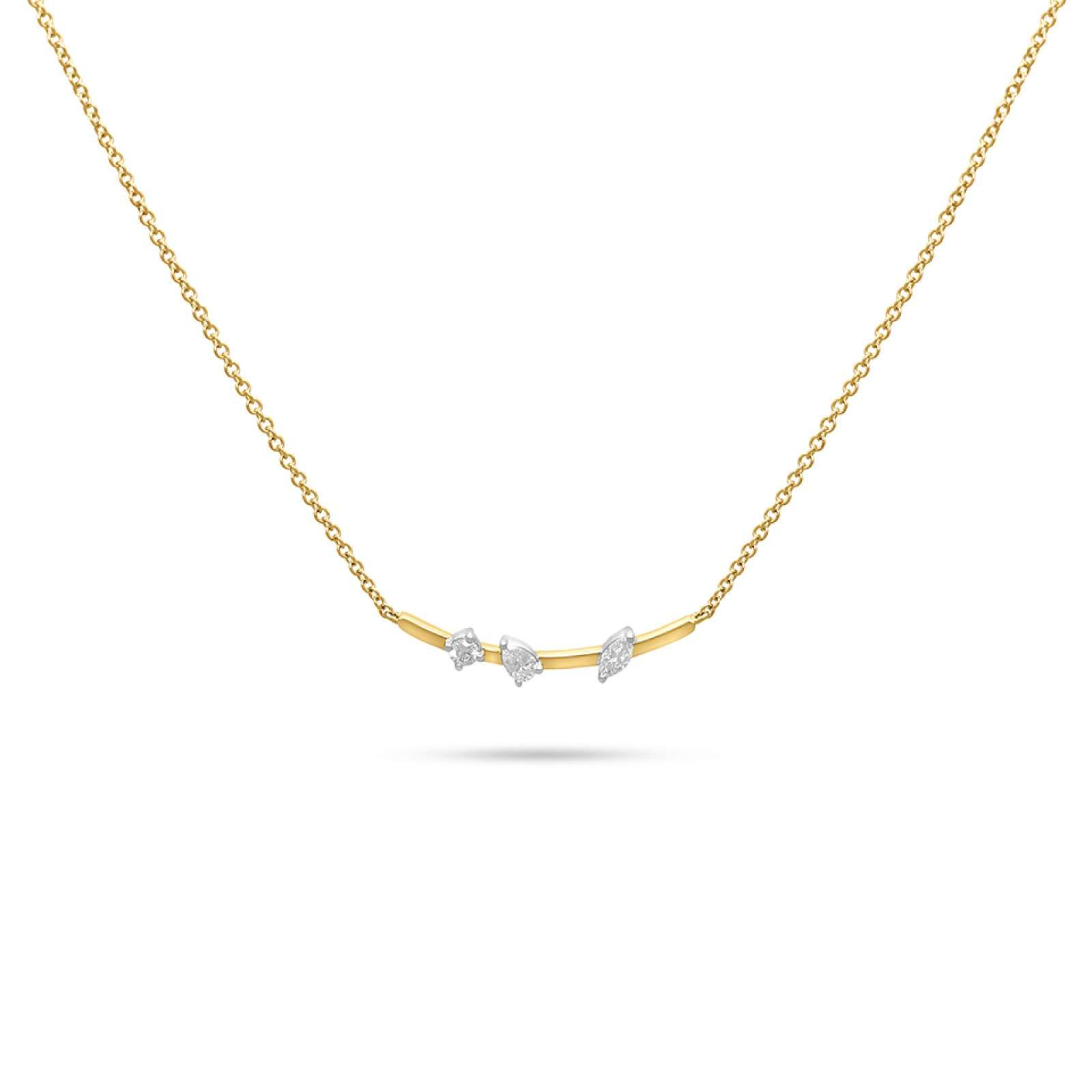 18ct yellow gold mixed shape diamond necklace featuring one brilliant, one pear and one marquise shaped diamond, H colour, SI clarity, all claw set in white gold and scattered on a solid yellow gold curved bar. With an 18" trace chain with option to wear at 16" for a higher neckline.