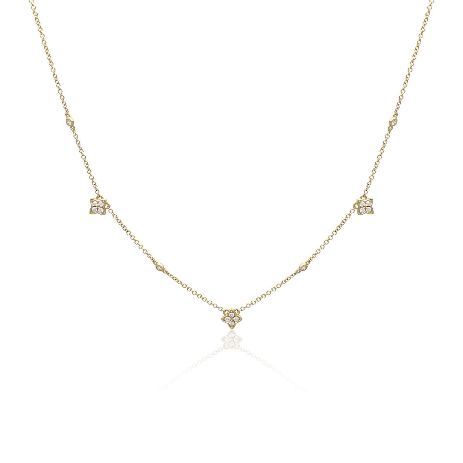 An elegant necklace showcasing three clusters of four diamonds interspersed with single diamonds on a fine trace chain, total diamond weight 0.27ct. H colour, SI clarity. Overall chain length 18" with two shorter length options for wearing with different necklines.