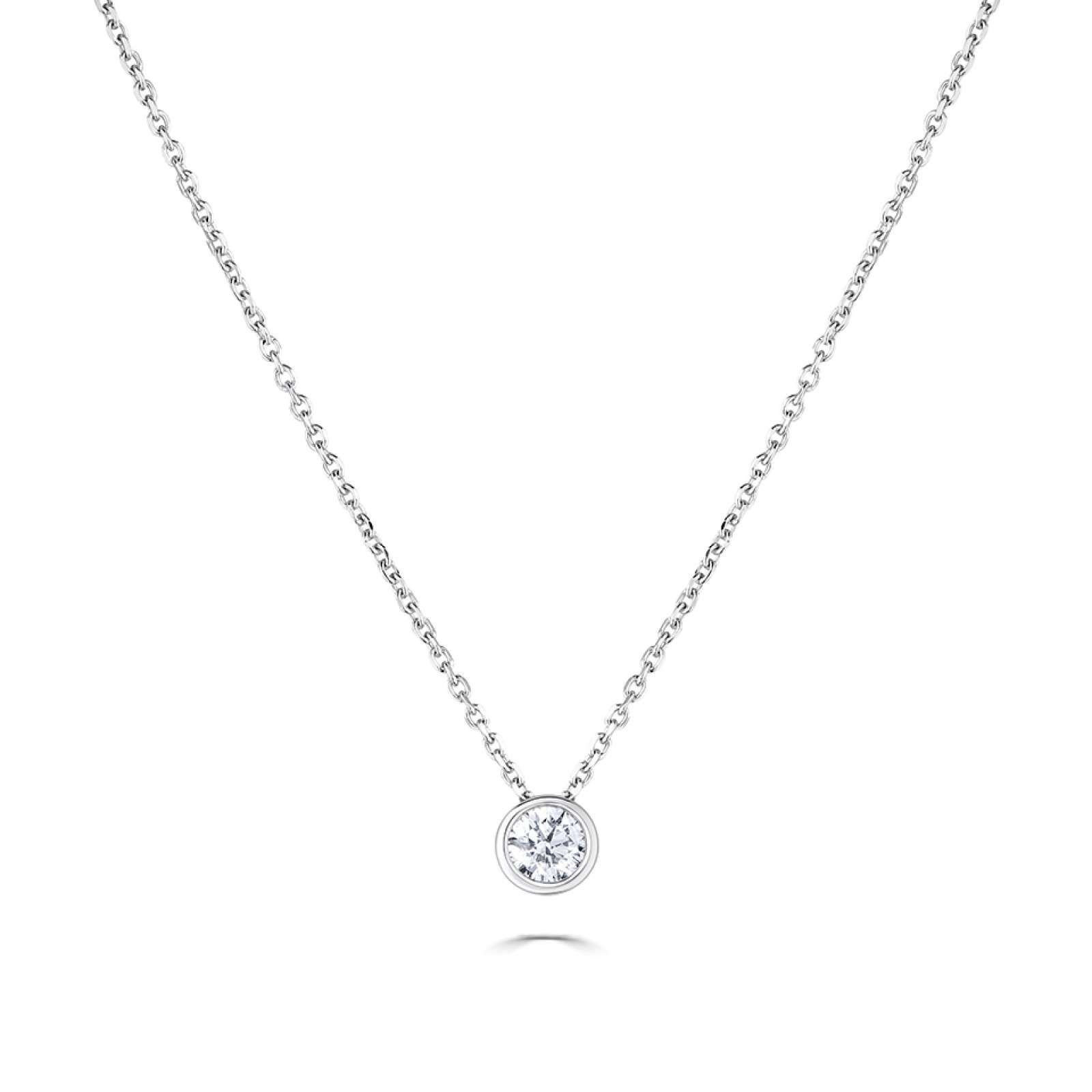A classic round rubover set pendant on an 18" chain, set with a natural diamond.