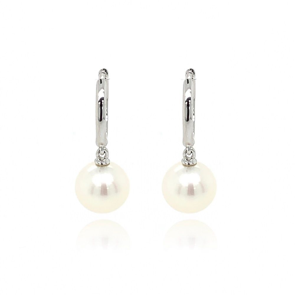 Classic white gold 'huggie' hoops (so called because they fit closely and hug the ear!) with a single white pearl drop.