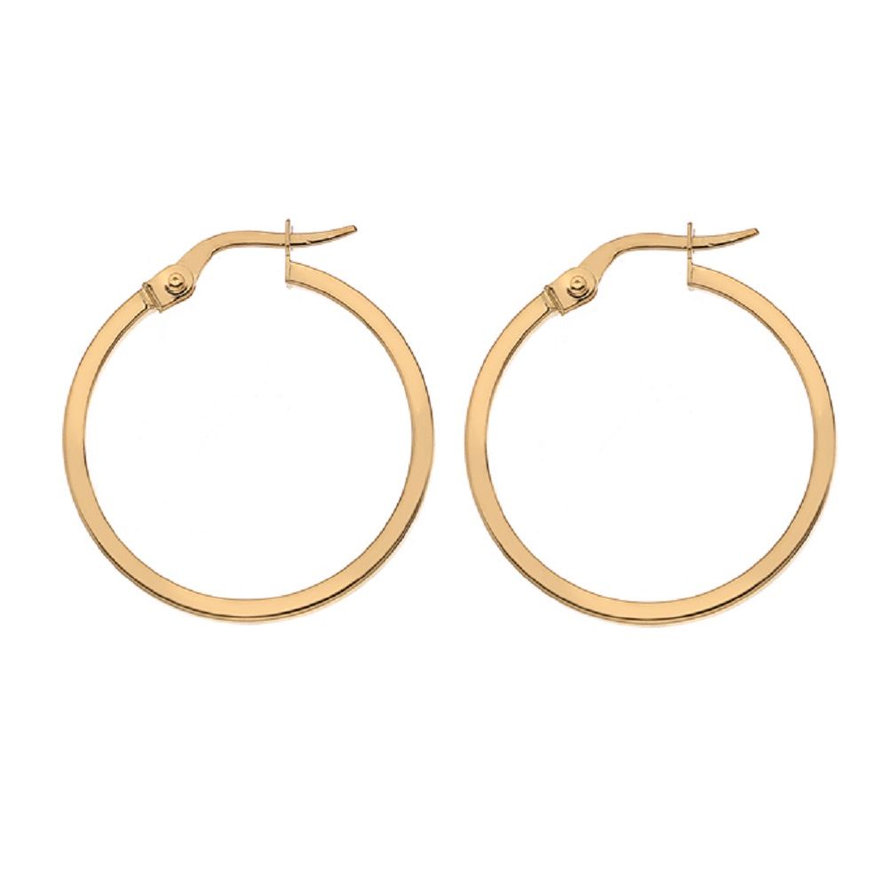9ct yellow gold 1.5mm square profile, 20mm diameter round hoop earrings with stem and hinge fittings.