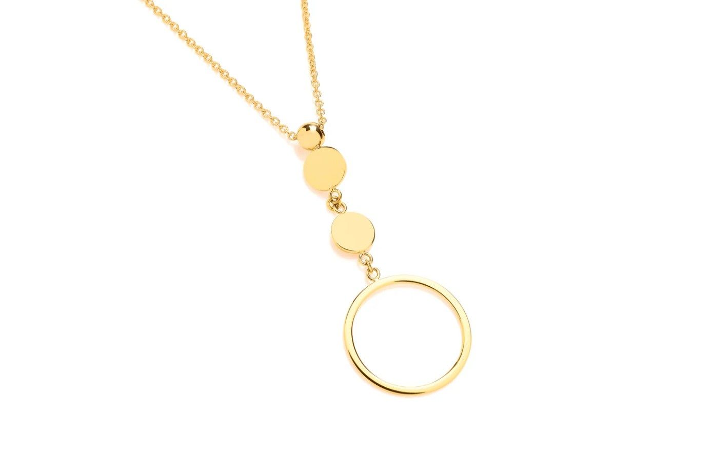 An elegant 9ct yellow gold necklace featuring closed and open discs on a fine trace chain.