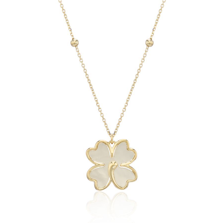This exquisite clover necklace feature a mother of pearl four-leaf clover design, 12mm in height, gracefully set in radiant yellow gold on a feature link trace chain.