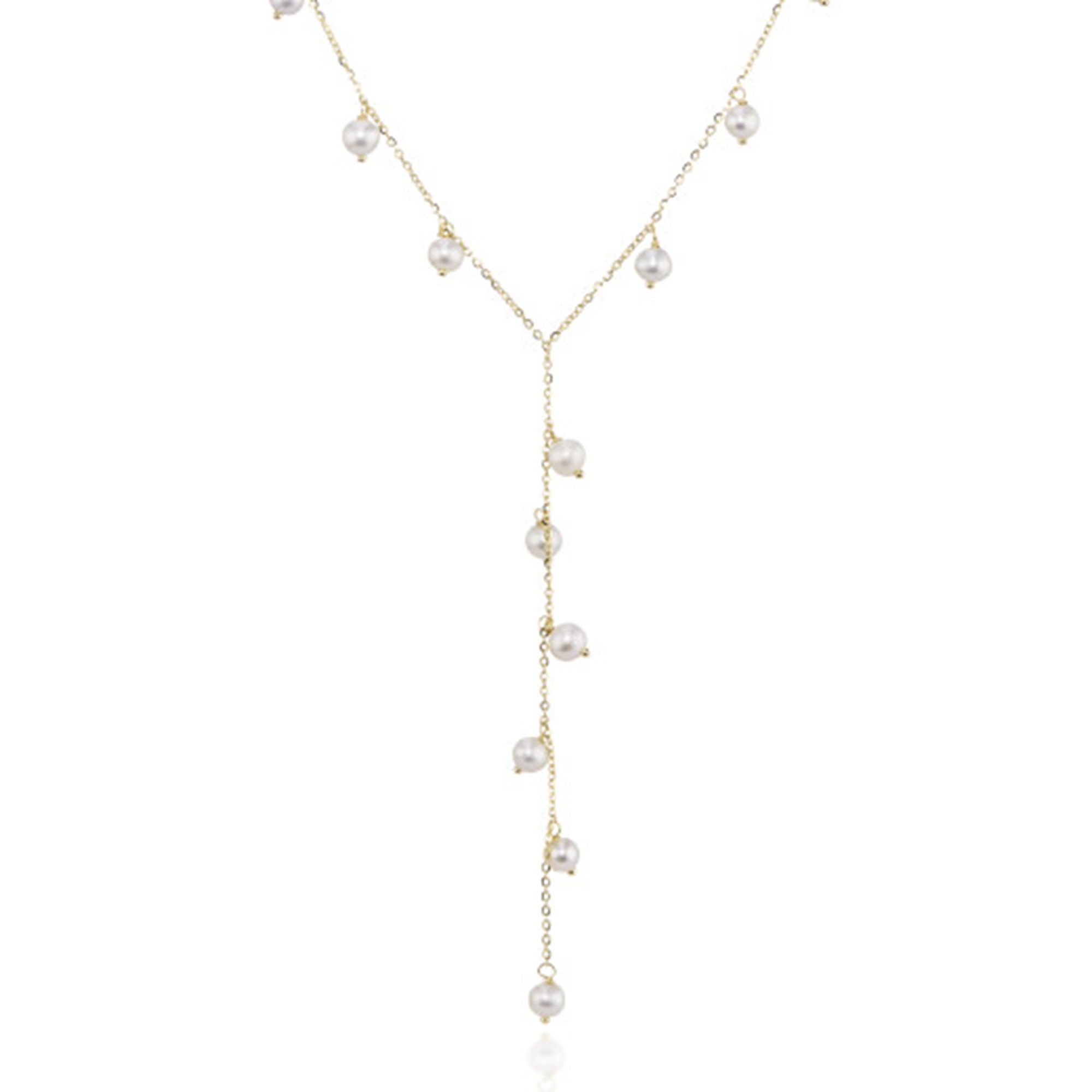 An elegant statement necklace, this 9ct yellow trace chain comes together in a V drop with an array of twelve freshwater cultured pearls. Overall length 18".