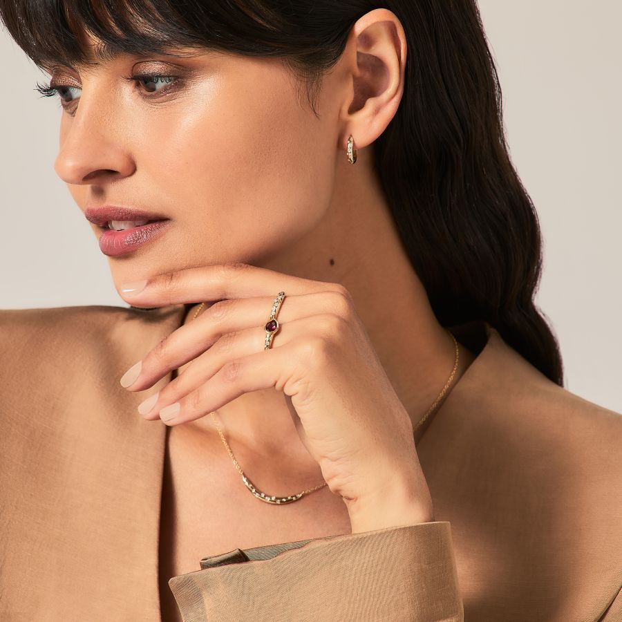 A beautiful blend of classic and contemporary styles, this 9ct yellow gold ring boasts a vibrant rhodolite garnet centrepiece complemented by shimmering diamond accent detail on the shoulders.