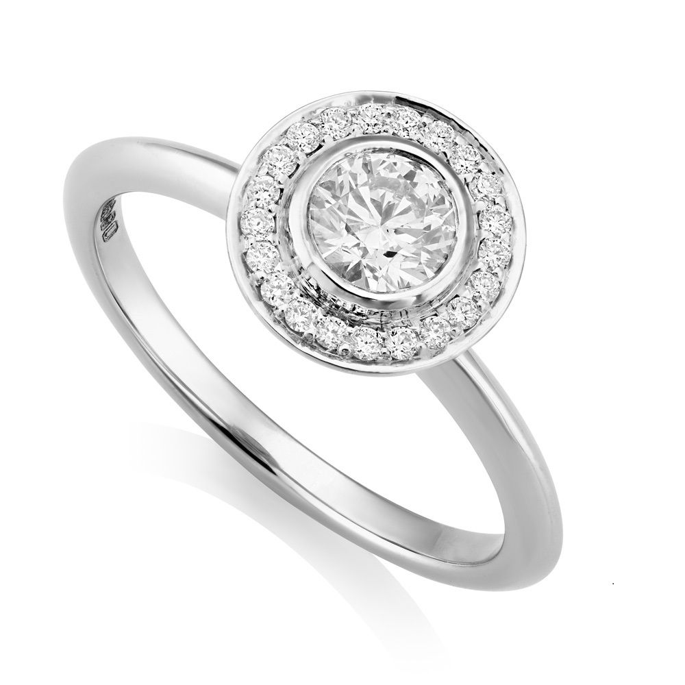 Strikingly modern platinum halo cluster ring with a 0.40ct. brilliant cut certificated centre diamond, E colour, SI2 clarity, rubover set, surrounded by a halo of brilliant cut diamonds, total diamond weight 0.50ct. The clean lines are enhanced by the narrow heavy d-shaped profile shank.