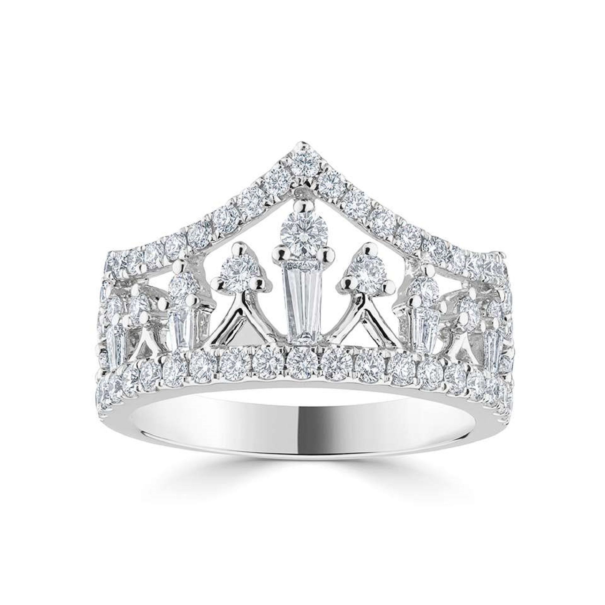 A show-stopping tiara style ring featuring a mixture of round and tapered baguette cut diamonds with a total carat weight of 1.05ct. Diamond colour H and clarity SI. Set in platinum with both claw and grain settings. Band width 12.8mm.