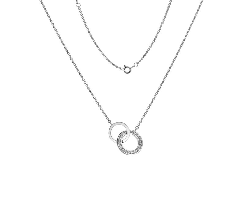 Timeless silver interlocking double circle pendant with sparkling cubic zirconia on an 18" trace chain.