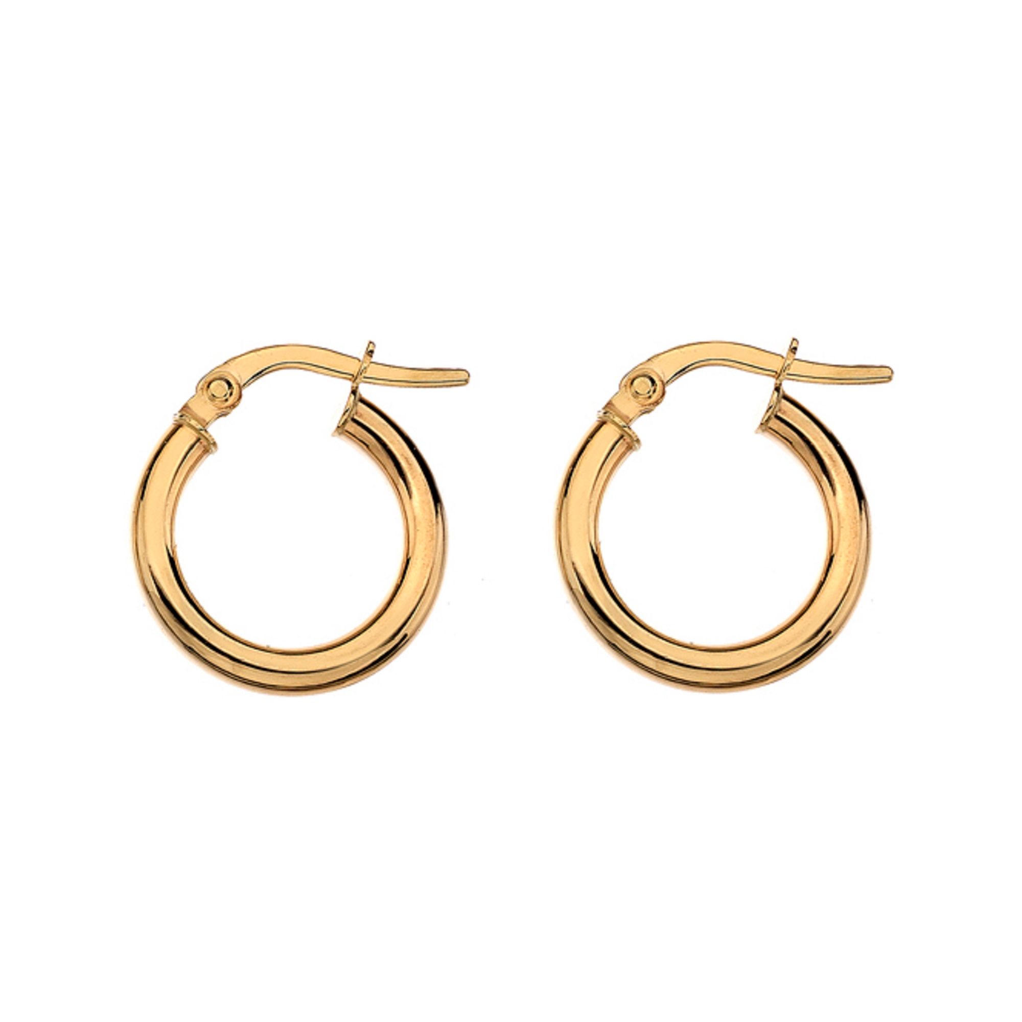 9ct yellow gold 1.5mm round profile, 12mm diameter hoop earrings with stem and hinge fittings. Perfect for any occasion!