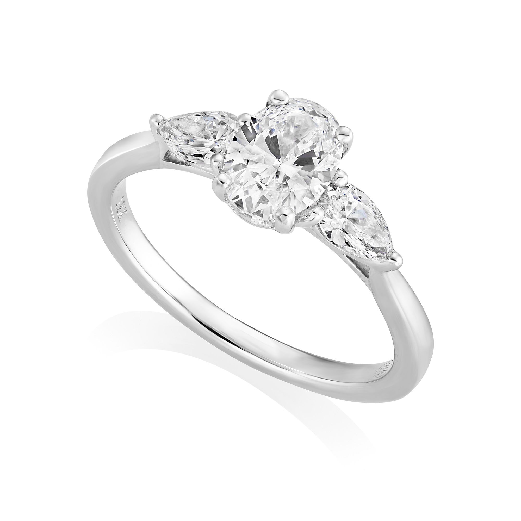 This stunning ring features a centre 0.43ct. certificated oval diamond, E colour, VS2 clarity, and two outer 0.14ct. pear shaped diamonds, total diamond weight 0.71ct., all claw set in a wedi-fit setting.