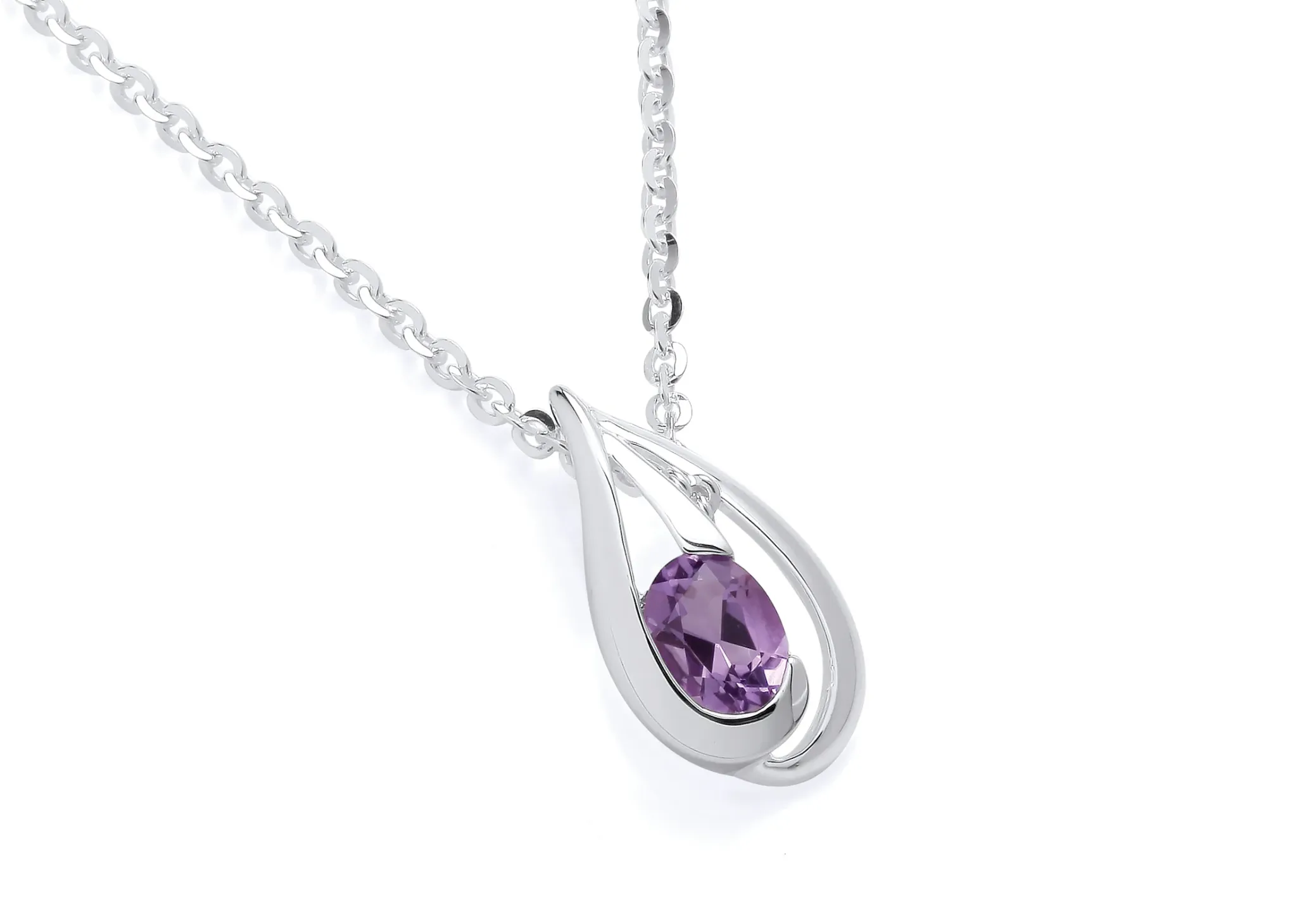 Highly polished silver pendant with oval amethyst gemstone in a teardrop frame, overall height 18mm.