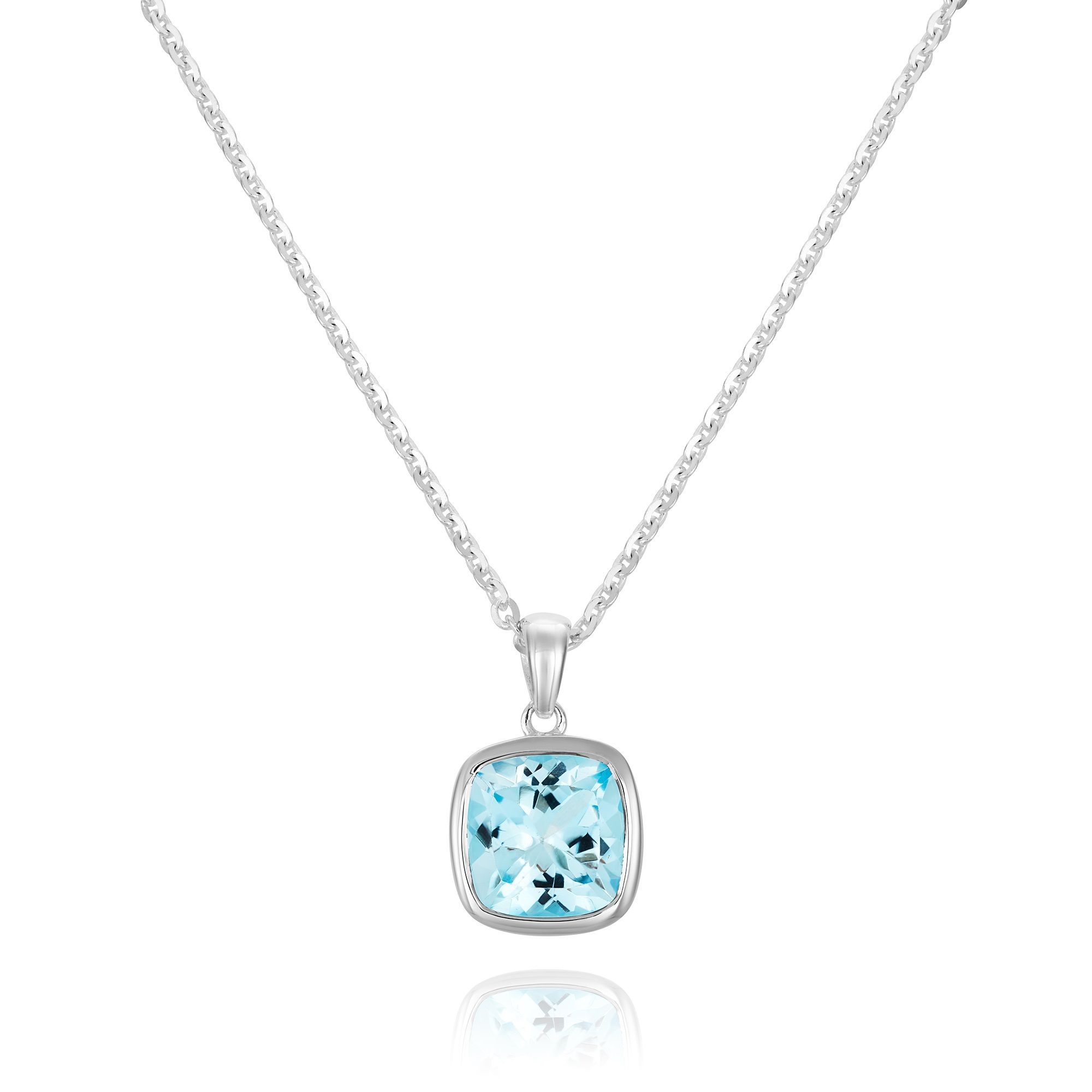 Vibrant cushion shaped Swiss blue topaz in a modern rubover setting, completed with a diamond cut sterling silver trace chain with lobster catch fastener.