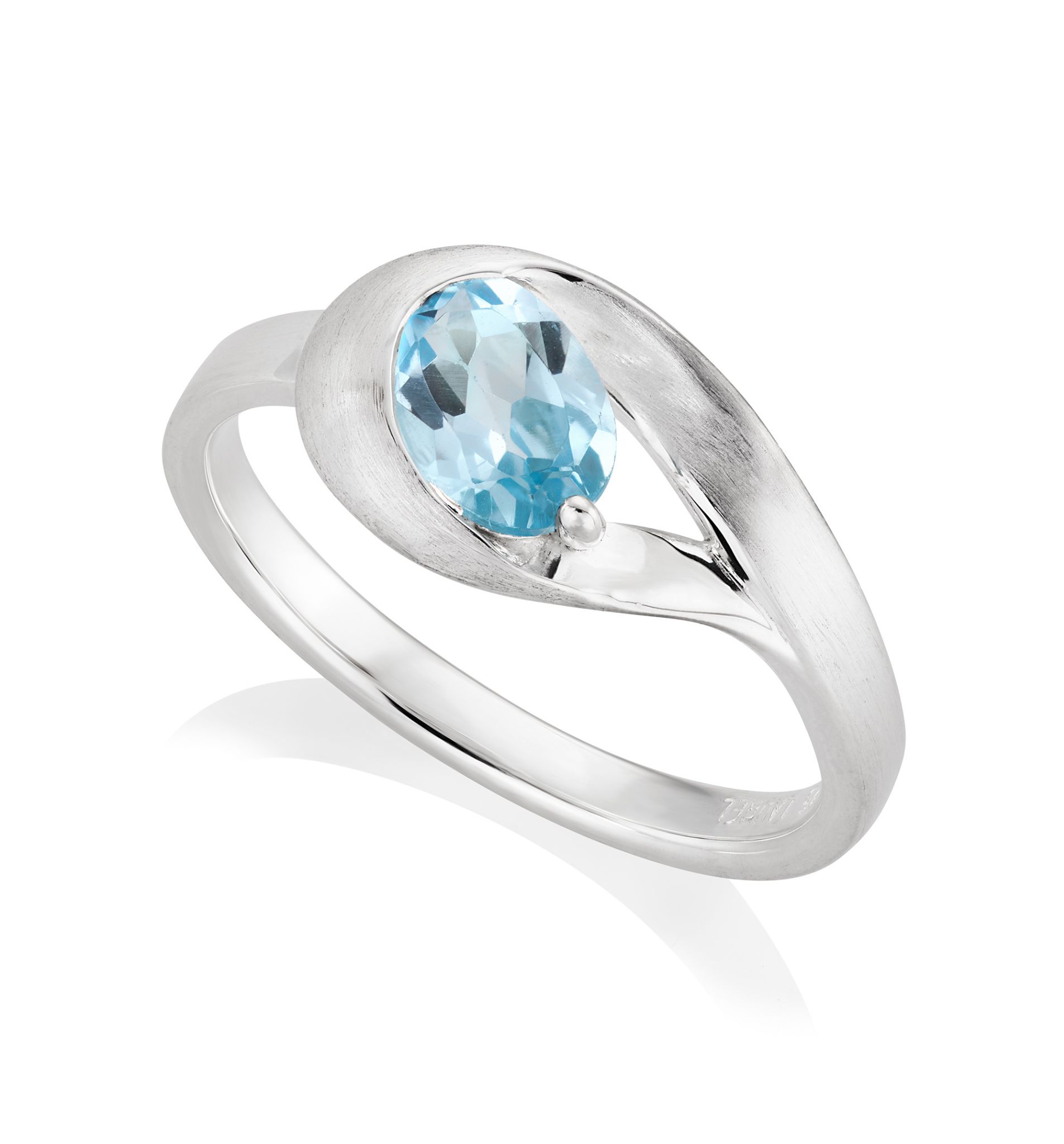 A simple yet eye catching design, with an oval Swiss blue topaz in matt finished sterling silver with a polished silver shank.
