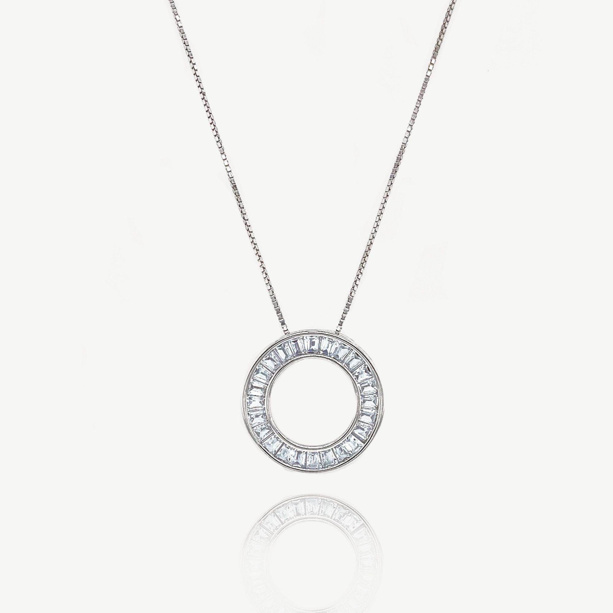 A lovely halo of baguette cut cubic zirconias in a channel setting and set in silver with a rhodium plated finish. Chain length 18" with an option to wear at 16" and 20".