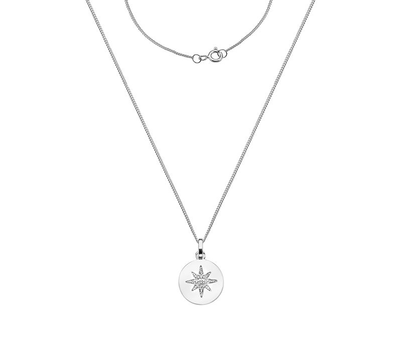 On trend silver disc with sparkling star design, ideal for layering or equally pretty worn on its own. Overall chain length 18"